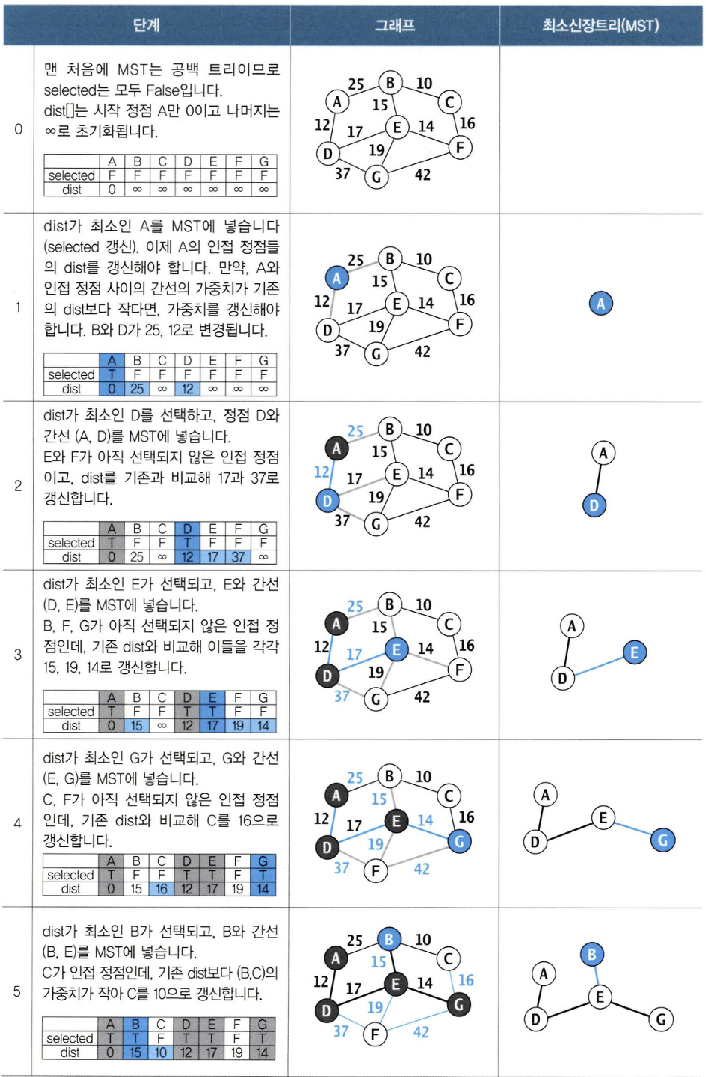 맨 처음에는 MST가 공백 트리이므로 배열의 모든 요소가 False가 되고, 단계마다 선택되는 정점이 True로 변경됨 - dist[ ]: 현재까지 구성된 MST와 정점 사이의 최단 거리를 저장
