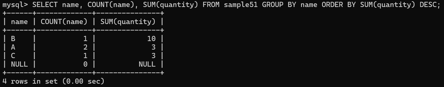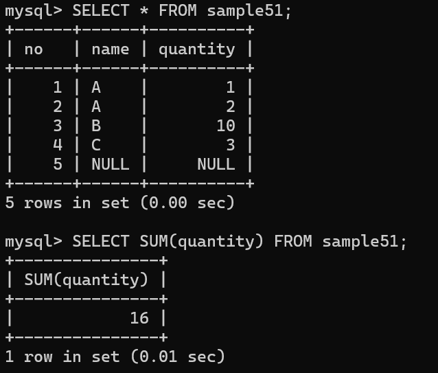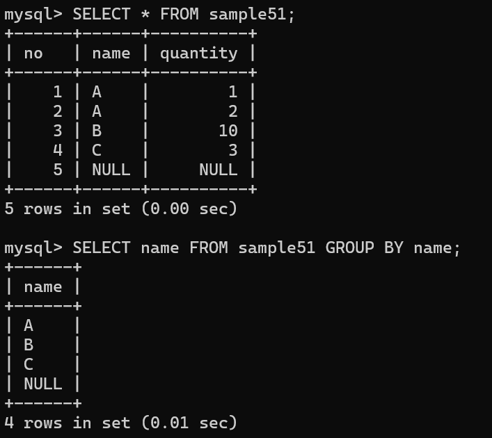 | SELECT no, name, quantity FROM sample51 GROUP BY name; name은 GROUP BY에서 지정하므로 OK, no와 quantity는 X |
