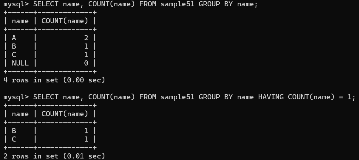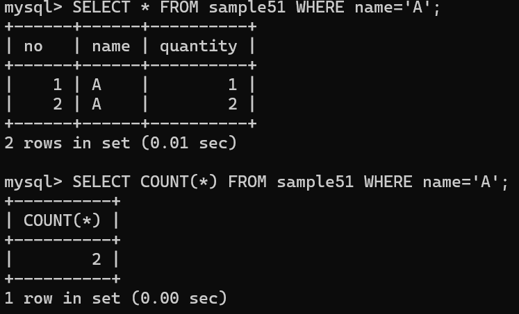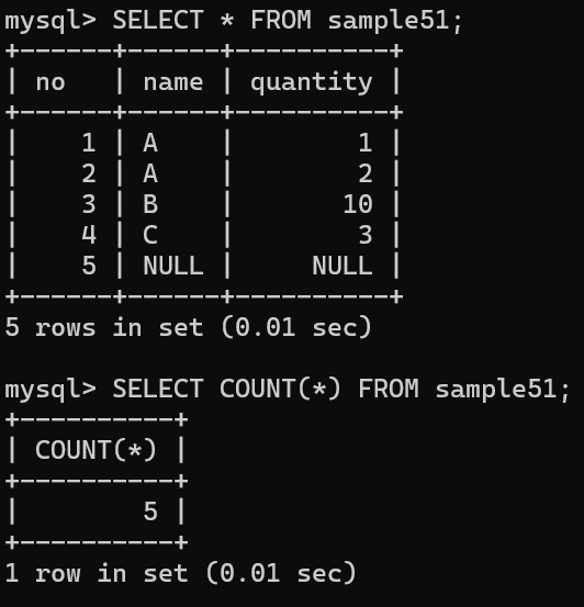 COUNT 함수를 사용하여 sample51 테이블의 행 개수를 구함