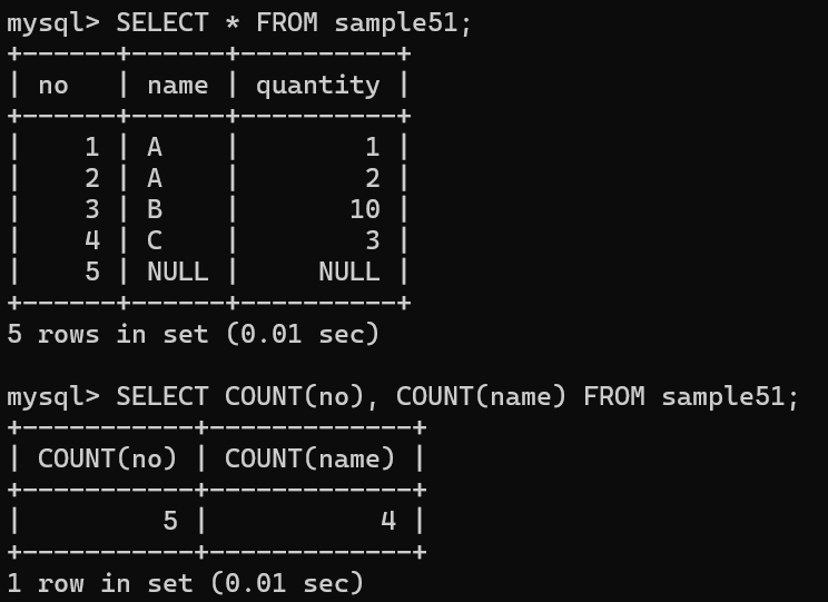 → name 열에는 NULL 값을 가지는 행이 하나 존재하므로 이를 제외한 개수 4가 됨
