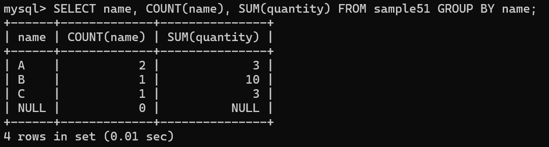 GROUP BY name에 의해 name 열 값이 A, B, C, NULL의 네 개 그룹으로 나뉨