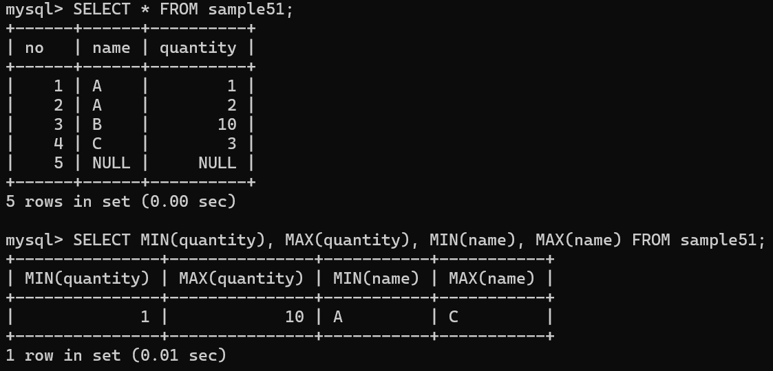 MIN 집계함수, MAX 집계함수 를 사용하여 집합에서 최솟값과 최댓값을 구할 수 있음