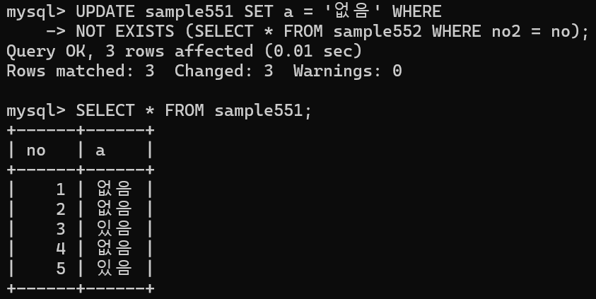 sample 552에 no열의 값과 같은 행이 있으면 '있음' 이라는 값으로, 행이 없으면 '없음'이라는 값으로 갱신함