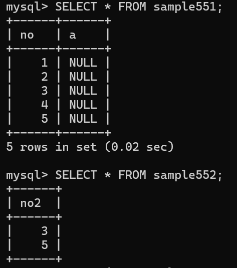 위의 예제에서 sample551의 열과 sample552의 열이 no, no2로 다르기때문에 제대로 동작했으나